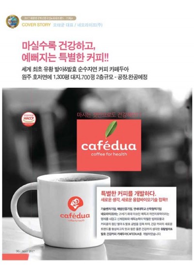 - 마실수록 건강하고, 예뻐지는 특별한 커피!! 세계최초! 유황 발아&발효 순수 자연커피, 카페두아 원주 호저면에 1,300평 대지, 700평 2층 규모 -공장,완공 대한민국의 커피 소비량은 전세계 TOP3안에 들만큼 남녀노소 누구나 즐겨 마시는 기호식품으로 널리 사랑받고 있습니다. 그러나 우리는 커피에 대해 그동안 건강을 위해 마시지는 않았습니다.그저 트랜드에 맞게 기호식품으로써 그 역할에만 충실한 문화를만들어 왔을 뿐입니다. 그러나, 네오라이프(주) 오태균 대표는 지친 현대인들을 위한 세계최초!! 유황 발아&발효 액상 커피인 카페두아를 출시하며 마실수록 건강한 커피로 국내 커피 시장에 당당히 도전장을 내밀고 있 어 주목을받고 있습니다. 일반커피는 카페인 함양이 많은 것이 사실, 카페두아는 건강까지생각한 커피로 신개념 건강과 힐링의 2마리 토끼를 잡으며 경쟁이 치열한 커피 시장에 경쟁력을 갖췄다는 평가를 받고 있습니다. 카페인은 낮추고, 커피속의 항산화물질인 폴리페놀,사포닌같은 건강한 성분의 흡수력을 높인 내몸에좋은 보약같은 건강 컨셉의 커피를 캐치프레이즈로 한국인의 입맛을 사로잡을 준비를 마친 네오라이프(주)오태균 대표에게 본지 <월간한국인>에서 카페두아에 대한 이야기와 커피이야기 그리고 앞으로의 계획에 대해 들어봤습니다. 21세기의 건강키워드, 해독(解毒)과 자연치유입니다. -카페인에 민감하여 가슴 두근거림과 속이 불편한 분 ,-쓴맛을 적게하고 독특하고 부드러운 맛과 향으로 나만의 커피를 즐기고 싶은 분,-그리고 날씬한 몸매 를 유지하고 싶은 분,-기분 전환과 스트레스로 고생 하는 분,-피곤한 직장인의 숙취해소와 운동전후 피로 회복을 위해,-그리고 신진대사의 원활한 작용으로 몸속 해독과 성인병을 걱정하는 분들 등 커피를 건강하게 마시고 싶은 분들을 위해 건강커피인 카페두아 (CAFEDUA)를 출시하게 되었습니다. ”웰빙시대가 도래하고 주5일제 문화정착과 현대인들의 건강에 대한 관심이 높다는 시대적 흐름을 일찍부터 꽤뚫어 본 오 대표는 차별화된 몸에 좋은 건강한 커피, 보약 같은 커피를 만들어 보면 어떨까 싶어서 세로운 건강커피 개발에 몰두 해 왔습니다. 특히 일체의 화학물질은 첨가하지 않는 100% 천연물질로 만으로 맛있는 커피를 만들 수 있다는자신감으로 순수 자연 커피‘카페두아’를 개발해냈습니다. “21세기 건강 키워드는 해독과 자연치유입니다. 지금 현대인들은 서구화된 식습관,인스턴트 식품, 가공식품과 과도한 육류섭취와 여기에 유해가스 그 리고 방사선과 자외선,스트레스 등 각종 유해환경에 노출되어 있어 체내 독소와의 전쟁이 시급한 상황입니다. ”해마다 혈관질환,성인병 환자들이 급증하는 것도 이 때문이라고 설명하는 오 대표는 이제 커피도 건강하게 즐길 때 라고 강조했습니다. 현대인들의 건강을 위해 몸에좋은 특별한 순수 자연커피를 개발해보자 이렇게 새로운 생각을 융합바이오기술과 접목하여, 건강하고 특별한 커피를 개발해 낸 네오라이프 ㈜는 신체정화와 해독능력이 탁월한 법제된 유황과, 커피콩의 첨단 발아&발효 공법을 접목하여 건강한 커피의 새로운 트랜드를 형성해냈다. 맛과 향은 물론 건강까지 생각한 유황 발아&발효 건강커피, 카페두아(CAFEDUA)를 개발해 낸 것입니다. 저희 네오라이프(주)는 NEO(새로운,혁신적인,희망찬)과 LIFE(생활)의 합성어로써 기술벤처기업, 해썹인증기업, 아시아로하스 인증기업 연세대학교 산 학협력기업으로 새롭게 도약하고 있는 기업입니다. 우리가 매일 마시는 커피를 과연 건강하게 마실 수는 없을까?라는 의문에서 시작하여 지금까지 달려왔다는 오 대표는 국민들이 건강하게 커피를 즐길 수 있으면 좋겠다는 일념으로 지금껏 고민하고 연구해 왔습니다. 그 결과 지난 2016년 자랑스런 한국 신(新)지식 인으로도 선정된 오 대표는 현재 원주시에 위치한 본 사에 카페를 운영하고 방문객들이 무료로 커피를 체험할 수 있는 공간을 마련해 놓고 있습니다. ”여기에 일자리 창출을 위한 Shop in Shop 형태로 프랜차이즈도 운영 중인 오 대표는 급증하는커피 수요에 발맞춰 원주시 호저면에 1,300 평 대지 350평 2층 약 700평 규모로 오는 5월 착공하 여 8월말 완공을 목표로 공장을 신축할 예정입니다. “중국 등 해외에서도 입소문을 타고 주문이 들어오고 있어 공장을 신축하게 되었습니다. 대량생산체제를 완비하여 수출판로를 개척해 나갈 생각입니다. 이제 전 세계인들이 카페두아를 즐길날도 멀지않는 것 같습니다.” 왜 카페두아인가? 차별화된 원두 건강커피로 경쟁력 갖춰 오 대표가 말하는 카페두아는 차별성은 커피콩 발아발효과정에서부터 라고 말했습니다. 휴먼상태에 있는 각종 효소가 활성화 되며 영양가는 높아지고 새로운 생리활성 성분인 파이토케미컬이 생겨나, 이는 쓴맛이 적어져 맛이 부드럽고 향이 은은하게됩니다. 또한 해로운 카페인 성분이 줄어들어 다량을 섭취해도 속쓰림이나 거북함이 없으며 100%천연성분으로 유해성분을 줄고, 유익한 성분을 그대로 보존할 수 있어 고급 원두 본연의 맛과 향을 즐길 수 있 는 강점이 있습니다. “사실 커피