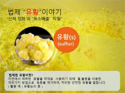 - 1.유황(硫黃)하면 무엇이 우선 떠오를까요? 유황 (Sulfur, 硫黃)이라 함은 보통 화산에서 뿜어내는 유황가스나 유황온천의 유황을 생각하는데, 이것은 광물질 무기유황입니다. 이것은 비금속원소로 원자번호 16번, 기호 "S"로 표현됩니다.또, 음식에서는 많이 들어본 이름이 유황오리일 것입니다.유황은 옛날 동의보감에서도 언급하고 있는 것으로 유기유황으로 복용해야 한다고 했습니다. -그래서 법제하거나 오리등 에게 먹여,무기유황을 유기화하여 간접적으로 섭취하도록 했습니다. -유황커피도 무기유황을 커피콩에 접목하여, 유기화 하여 간접적으로 먹도록 한 것 입니다. 자연계의 유기유황은 단백질에 가장 많습니다. 20여 종류의 아미노산 중에 메치오닌(methionine)과 시스테인(cysteine)라는 아미노산에 황(S)성분이 들어 있습니다. 전자(메치오닌)는 반드시 음식으로 섭취해야 하는 필수아미노산이고, 후자(시스테인)은 인체내에서 합성이 가능한 비 필수아미노산입니다. 대부분 우리 몸에 필요한 거의 모든 유황은 음식으로 먹는 단백질에서 공급됩니다. 부수적으로 계란, 우유, 마늘, 양파 등 음식에서 일부 섭취하기도 합니다. 동식물에 포함된 황(S) 유기화합물의 종류 -동물 포함되어 있는 곰의 쓸개, 우황청심원의 원료 소의 담즙, 사향노루의 사향 -식물에 포함되어 있는 마늘,파,양파,부추,인삼등 그렇다면, 우리 몸에서의 황(S)은 무엇인가? 황(S)은, 유황(硫黃)=설퍼(sulfur, S)원자번호 16번으로 기호 "S" 이며, 산소족 원소로 학문명은 "황" 또는 "유황"이라 칭합니다. 어원은 영어로 Sulfur(설퍼)로 '불의 근원"을 뜻합니다. 토양의 산성화를 방지하고, 토양 속의 오염을 제거함으로써, 지력을 회복시킬 수 있는 성질을 가지며, 인체 내에서는 축적된 잔류 유해성분을 스스로 해독,배출 하는 능력이 탁월한 물질로 알려져 있습니다. 유황(S)는 생체조직에 다량으로 들어있는 미네랄중의 하나로 즉, 인간의 몸을 구성하고 있는 다량의 생체 원소에는 수소 (H), 산소(O), 질소(N), 유황(S), 나트륨(Na) 등을 포함한 14종류가 있습니다. 이들 원소들은 인체를 구성하는 총 원소 중 99.99%를 차지하고 있는 주체적인 원소들입니다. 그 중 유황은 우리 몸속에서 8번째로 많은 비율을 차지하고 있습니다. 유황과 산소는 '생물의 호흡, 동화작용, 신진대사'등 생명활동에 없어서는 안될 가장 중요한 물질로 산소와 유황 없이는 동식물이 절대로 생존할 수 없습니다. 황(S)은 우리 몸의 모든 부분에 포함되어 있으며, 약 0.25%를 함유하고 있습니다. 주로 황(S)은 시스테인, 시스틴, 메티오닌 등의 황을 함유하는 아미노산, 글루타치온, 타우린, 비타민B, 비오틴 등 각종 유기화합물 등에 포함되어 존재합니다. 유황(S)은 화산지대에서 황색의 결정으로 많이 존재하는 물질입니다. 황화합물로서도 온천에도 들어있어서 독특하고 강한 냄새를 발하는 원소로도 알려져 있습니다. 또, 마늘이나 양파에도 황화합물이 들어있어서 자극성이 강한 특유의 냄새를 발생시킵니다. 머리카락이나 손톱을 태울 때 나는 냄새는 황이 포함된 아미노산(시스테인 등)에서 나는 것입니다. 우유나 두부처럼 단백질이 풍부한 식품을 익혔을 때의 풍미에도 관여합니다. 황(S)은 우리 몸에서 어떤 기능을 하고 있을까? 황(S)은 우리 몸에서 아미노산(메치오닌,시스테인) 으로 존재하며, 많은 부분에서 중요한 역할을 하고 있습니다. 먼저 우리 몸의 각종 조직과 생체내의 주요 물질의 구성물로서 기능을 합니다. 생체내의 시스테인, 시스틴, 메티오닌 등의 황을 함유하는 황아미노산은 효소, 단백질, 조직, 피부, 손발톱과 모발을 구성하고 있습니다. 점성다당류의 구성성분인 콘드로이친황화염은 뇌, 건, 골격, 피부, 연골, 힘줄, 뼈, 심장판막 등을 구성하고 있습니다. 황지질은 간, 신장, 활액막, 뇌의 백질 등을 구성합니다. 특히 다른 단백질보다도 단단하고 튼튼하게 하는 작용이 강합니다. 피부와 머리카락을 강하고 윤기 있게 하고 튼튼한 손톱을 만드는 기능을 가지고 있습니다. 또한 황은 췌장호르몬인 인슐린의 성분이며, 항응혈물질인 헤파린의 성분이며, 보조효소역할을 하는 티아민, 비오틴, 리포산, 코엔자임A의 성분입니다. 게다가 산화, 환원 작용의 필수성분인 글루타치온의 비타민G 성분이고 산, 염기의 평형에 관계하며, 세포외액에 존재하는 이온화형태의 황산염의 성분이기도 합니다. 2. 또한 페놀류, 크레졸류, 등과 같이 해로운 물질과결합하여 비독성물질로 변환시킨 후 소변으로 배설시키는 활성형 황산염의 성분이기도 하고 그 외에 간의 담즙의 분비를 돕는 기능을 가지고 있습니다. 황의 흡수는 대부분 유기물의 형태인 황아미노산으로 소장에서 흡수되며 무기물 형태로써는 흡수가 잘 되지 않습니다. 흡수된 황아미노산은 황산을 생산하며, 생산된 황산은 중화되어 무기염의 형태로 체외로 소변을 통하여 배설됩니다. 중금속의 중독에 예방적인 역할을 하는 것으로 알려져 있습니다. 단백질을 많이 먹는다면 황이 부족하여, 나타나는 증세는 드물지만 만일 황이 부족하게 되면 피부염, 각기병, 신경염, 머리카락, 손톱, 발톱의 연화증 등의 증세가 많이 나타